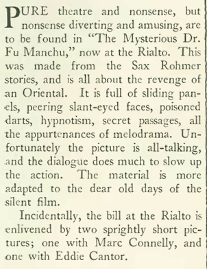 …if you weren’t into weepers like Wonder of Women, you could have instead checked out The Mysterious Dr. Fu Manchu at the Rialto Theatre…