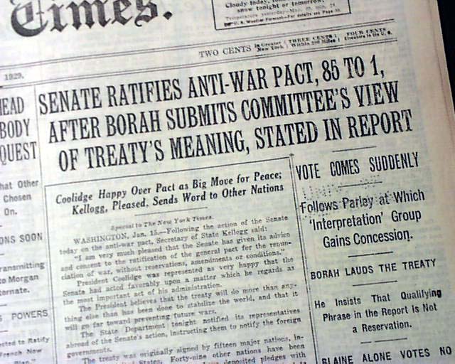SURE, WHY NOT?…The U.S. Senate approved the Kellogg–Briand Pact on Jan. 15, 1929. The treaty went into effect later that year on July 24. (The New York Times)