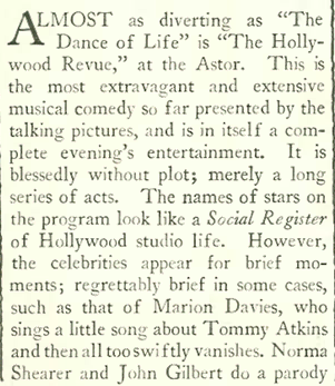 MGM piled so many stars and gimmicks into the premiere of The Hollywood Revue of 1929 that even TheNew Yorker’s jaded film critic John Mosher had to admit he was entertained.