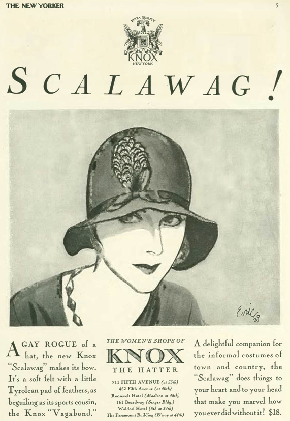 …and for reference, the cloche hat called a “Scalawag” was featured in this ad by Knox in the March 30, 1929 New Yorker…drawing by Carl “Eric” Erickson…