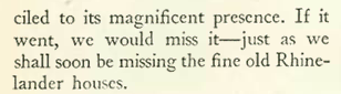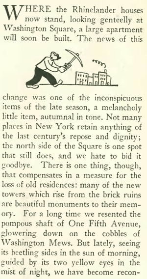 The rapid demolition of old New York was a recurring theme in The New Yorker of the 1920s, the magazine often wavering between nostalgia and the thrill of the new. No place was perhaps more sacred than the stately row houses of Washington Square. When news circulated that a section consisting of the old Rhinelander mansion would soon fall (for the sake of a new apartment building), “Talk” tried its best to process the change: