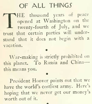 Also known as the “Pact of Paris” and more officially the “General Treaty for Renunciation of War as an Instrument of National Policy,” its authors, United States Secretary of State Frank B. Kellogg and French foreign minister Aristide Briand, gathered world powers in Paris on Aug. 28, 1928 to sign a treaty that denounced the use of war and called for the peaceful settlement of all future disputes. The New Yorker, in the opening “Notes and Comment” section of “The Talk of the Town,” took its usual “What, Me Worry?” approach to world affairs, finding the whole thing unnecessary given that (in its view) Europe was already a peaceful, even benign continent: