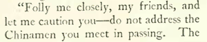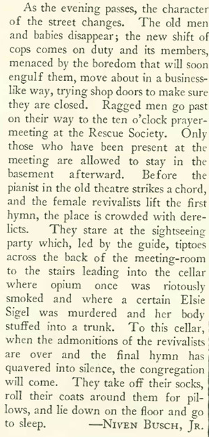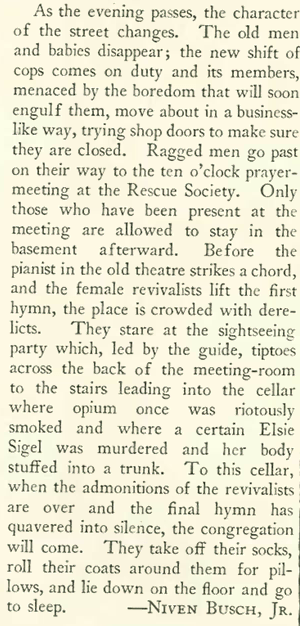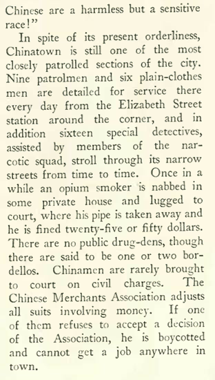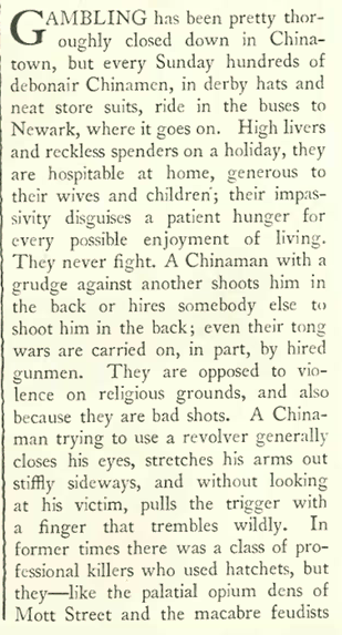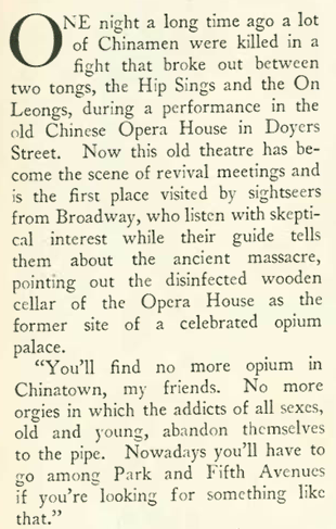 In the “Reporter at Large” column, Niven Busch Jr. paid a visit to “The Yellow Bowery,” as the piece was titled. Notable in this article (and in Brubaker’s quip above) is the use of term “Chinaman,” a term considered offensive today but in the 1920s was used indiscriminately for East Asians. Here it seems pejorative: