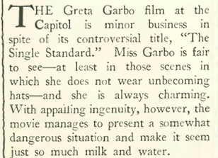 We all know Greta Garbo as one of the greatest film stars of classic Hollywood. Her mysterious aura and subtlety of expression are still lauded by film critics today. The New Yorker, however, never seemed particularly enamored of the star’s performances. Here is a review of her 1929 silent film, The Single Standard: