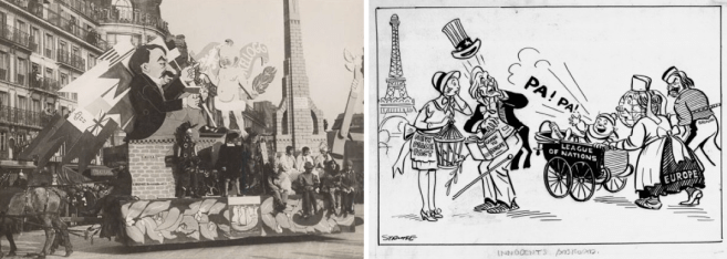 PARTY POOPERS…TheNew Yorker wasn’t alone in poking fun at the Kellogg–Briand Pact. At left, the pact is mocked during the Paris Carnaval in 1929; at right, British cartoonist Sidney Conrad Strube reminded readers of the outcome of America’s earlier efforts at world peace. (Wikipedia/Pinterest) click to enlarge.WE JUST CAME TO SAY HELLO…Germany, the first signatory to the Kellogg-Briand Pact banning all war, invaded Poland just ten years after that treaty went into effect. Above, German troops parade through Warsaw after the invasion, September 28-30, 1939. (National Archives and Records Administration)