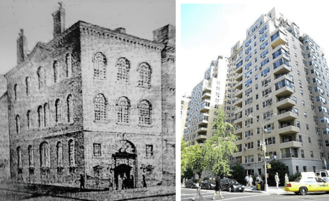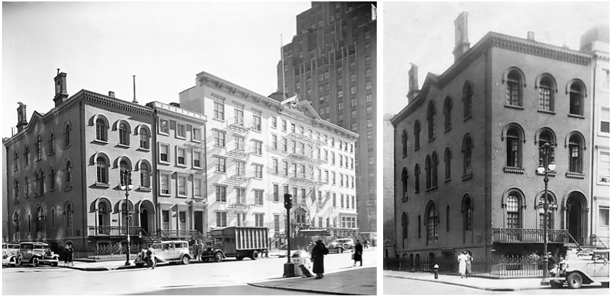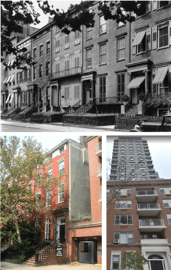 LOOKING GOOD AFTER A CENTURY…At left, Berenice Abbott took this photograph of No. 21 Fifth Avenue in 1935. At right, in a close-up shot from the same period, the 1924 plaque from the Greenwich Village Historical Society is visible on the side of the house. (Museum of the City of New York/Greenwich Village Historical Society)A NOW FOR SOMETHING COMPLETELY DIFFERENT…A proposed 1929 remodeling (left) moved the front door of the old Brevoort mansion to the center and lowered it to street level. At right, today the 1955 Brevoort apartment house occupies the site. (daytoninmanhattan.blogspot.com)
