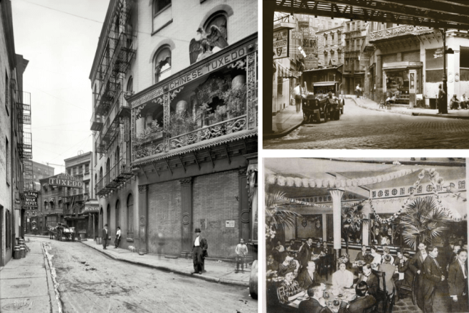 THE OTHER SIDE OF THE TRACKS…2 Doyer Street was the address of the Chinese Tuxedo Restaurant. It attracted non-Chinese patrons, particularly those who considered themselves ‘Bohemians’ as well as businessmen looking for an ‘exotic’ night on the town. And it helped that the Tuxedo was near the elevated train. (Courtesy Flickr/straatis/thelodownny.com)