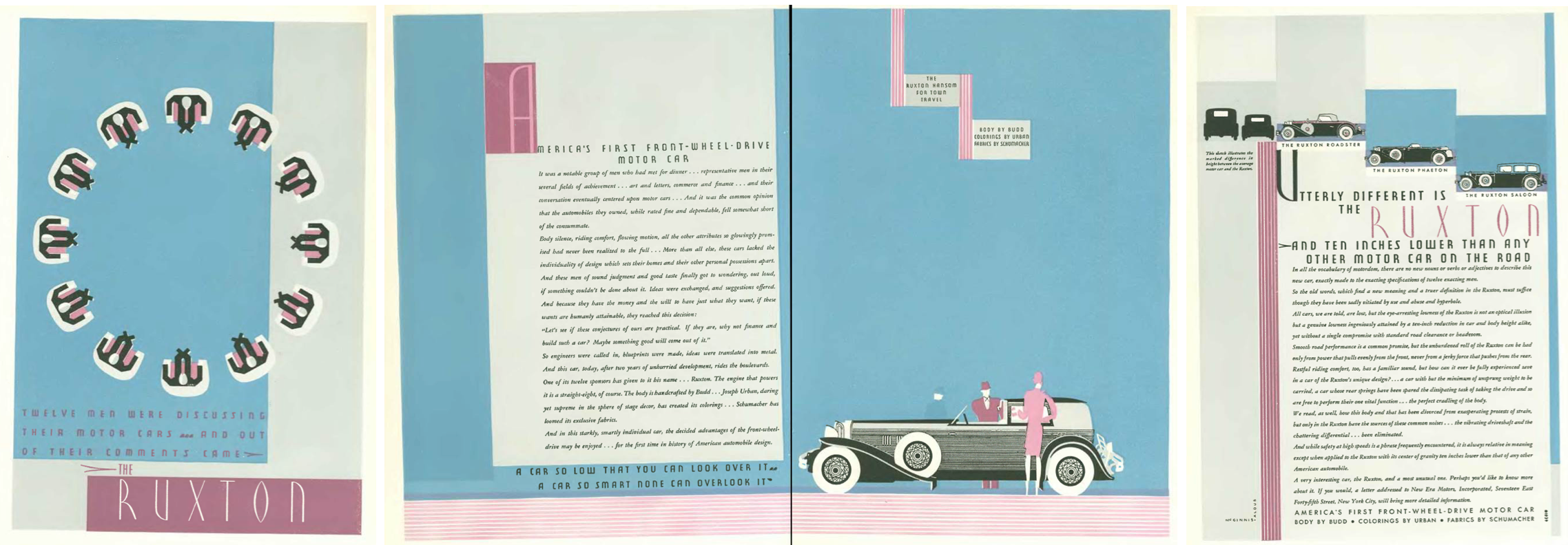 …a brand-new car—The Ruxton— was introduced to New Yorker readers in this color advertisement that spanned four pages (click image to enlarge)…