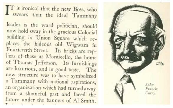 In one of my recent posts (Not Your Grandpa’s Tammany Hall) I noted a “Talk” item that described the new Tammany headquarters. In the August 3 issue the magazine introduced the patriotic society’s new leader, John Francis Curry, in a profile written by Henry F. Pringle. In the piece, titled “Local Boy Makes Good,” Pringle suggested that Curry’s old-fashioned approach to politics stood in contrast to the new image Tammany Hall was attempting to project: