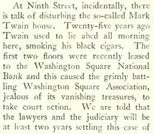Jumping back to the Aug. 10 issue, “The Talk of the Town” reported on the possible remodeling or demolition of a house once occupied by Samuel Clemens, aka Mark Twain. The house in question was a lavish old mansion built by Henry Brevoort, Jr. in 1834, at the northwest corner of Fifth Avenue and 9th Street. Twain lived in the house from 1905 to 1908, and it was there that Twain’s biographer Albert Paine conducted interviews with the author and wrote the four-volume Mark Twain, a Biography; The Personal and Literary Life of Samuel Langhorne Clemens. When millionaires abandoned their Fifth Avenue mansions in the 1920s and high-rise apartments took their place, there was pressure to either convert an old mansion like the Breevoort house at 21 Fifth Avenue to apartments or demolish it altogether.