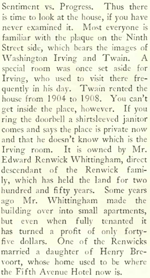 The Greenwich Village Historical Society did what it could to save the house, and in 1924 affixed a bronze plaque to a side wall noting that both Twain and Washington Irving were once occupants. When the house was slated for demolition in 1954, the Society appealed to New Yorkers to raise the $70,000 needed to move the building, but only a fraction of that amount was secured. No. 21 was demolished in 1954 along with the rest of the houses on that block.