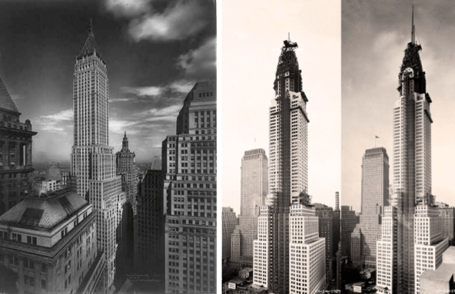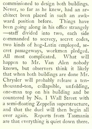 As it turned out, William Van Alen did not have to compete against himself, the commission for One Wall Street instead going to Ralph Walker, who would design a beautiful art deco landmark that, at 50 stories, would not vie for the title of the world’s tallest building. Unbeknownst to The New Yorker, and perhaps Van Alen, the challenger would instead be 40 Wall Street, which would hold the crown as world’s tallest for about a month. Thanks to some sleight of hand (see caption below) the Chrysler building would quickly surpass 40 Wall Street and hold the title for just eleven months, bested in the end by the Empire State Building (which would sport a “Zeppelin superstructure”).