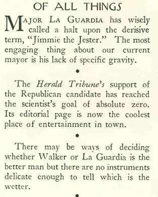 Howard Brubaker, in his Aug. 17 “Of All Things” column, suggested that La Guardia had a zero chance of getting elected. Just three years later, Walker would resign amid scandal and flee to Europe. La Guardia, on the other hand, would be elected to the first of his three terms as mayor in 1933, riding the wave of the New Deal.