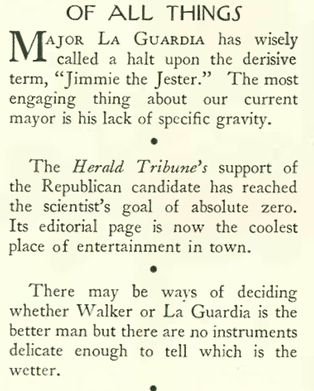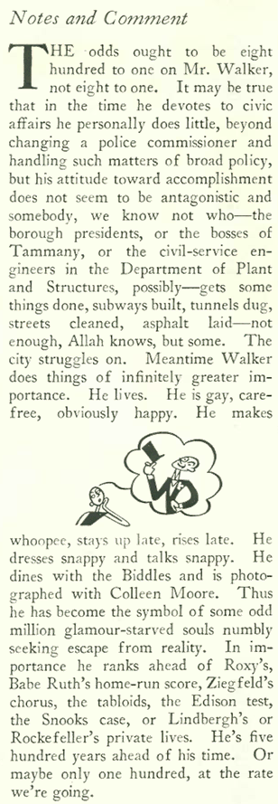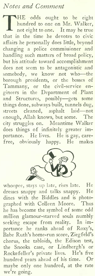 The famously flamboyant New York City Mayor Jimmy Walker lived the easy life during his initial years as Hizzonner, riding a booming economy, partying with the rich and famous (while flaunting Prohibition laws), carousing with his mistress (Ziegfield dancer Betty Compton) and sleeping until noon. When reform-minded Fiorello La Guardia challenged Walker’s reelection bid in 1929, Walker left the dirty work to his Tammany Hall cronies and continued to charm the public, and The New Yorker. The Aug. 17 “Talk of the Town” observed: