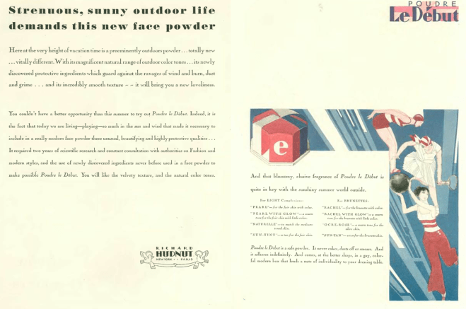 …and with that blazing sun advertisers also promoted a number of face creams and powders to those “enjoying the sunny outdoor life,” including this two-page spread from Richard Hudnut and Poudre Le Début…