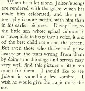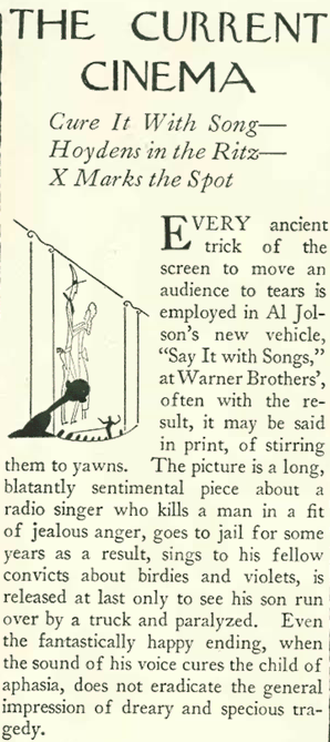 After appearing as Al Jolson’s dying son in The Singing Fool (1928), the child actor Davey Lee returned to the screen for yet another Jolson weeper, 1929’s Say It With Songs. Once again portraying Jolson’s son—this time crippled and rendered dumb after being hit by a truck—he miraculously recovers at the end of the film. The New Yorker wasn’t having any of this sentimental treacle, especially served up for a second time…