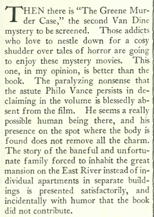 …often cast as a heavy in silent films, it was the “talkies” that made William Powell a star, his pleasant voice more suited to a hero or leading man than a villain. In The Greene Murder Case, Powell portrayed amateur detective Philo Vance, a role that he played in another 1929 release, The Canary Murder Case (originally filmed as a silent in 1928), both based on mystery novels by S.S. Van Dine. Powell would portray Philo Vance in three more films from 1930 to 1933 until he took on the role of another amateur detective, Nick Charles, in 1934’s The Thin Man (a role he would reprise five times from 1936 to 1947)…