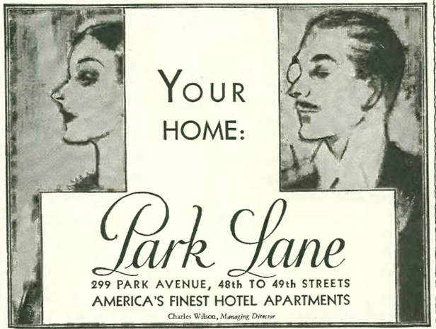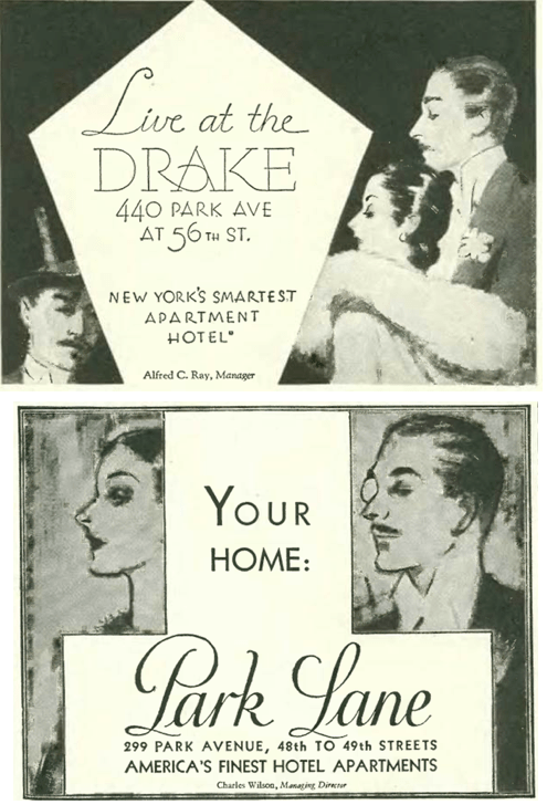 This week we have an advertisement for the Drake Apartment Hotel, claiming to be the “smartest” in New York. Note how they employed what seems to be the same pointy-nosed, haughty couple that we saw last week (below) who endorsed the Park Lane (I want to believe there is a subtle joke here)…