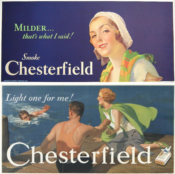 QUICK…THROW THAT MAN A CIGARETTE!…Examples of Charles Edward Chambers’ Chesterfield ads from 1929 featuring model Virginia Maurice. Note that Maurice is wearing the latest “rolled brim” hat style in the upper image. (Pinterest)HIS NONSMOKING SECTION…A 1919 Harper’s cover illustration by Charles Edward Chambers. (Wikipedia)