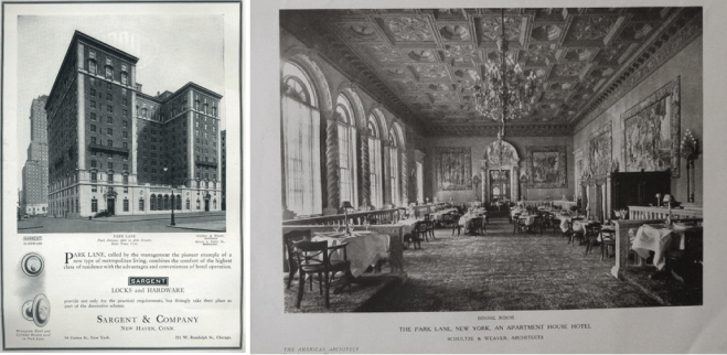Circa 1924 advertisement from the Sargent lock and hardware company touting its fixtures in the new Park Lane hotel apartments. At right, circa 1924 image from The American Architect depicting the Park Lane’s dining room. The building is long gone, razed some time in the 1960s to make way for an office tower. (Pinterest)