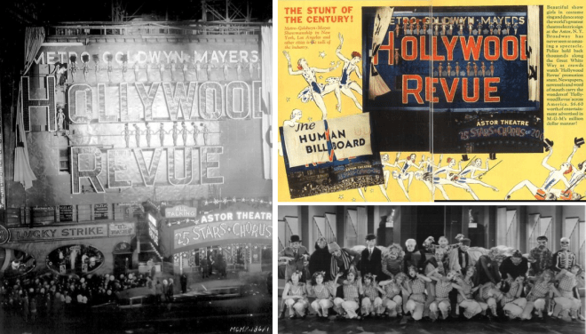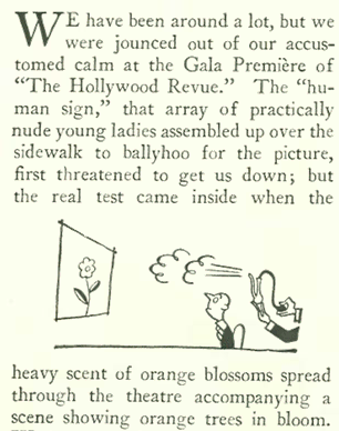 …MGM deployed a number of stunts to generate publicity at the film’s New York premiere at the Astor Theatre, including a “human billboard” that featured scantily clad chorus girls precariously perched on a huge letters high above the theatre’s entrance. In a rather less dangerous stunt—during the movie’s “Orange Blossom Time” skit—a faint scent of orange blossoms wafted into the theatre. “The Talk of the Town” observed…