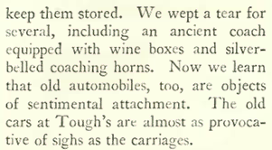 I found this “Talk” item curious for exploring the sentimental attachment some folks had developed for old cars from the 1910s, given those cars were barely twenty years old and cars in general hadn’t been in common use much longer…