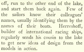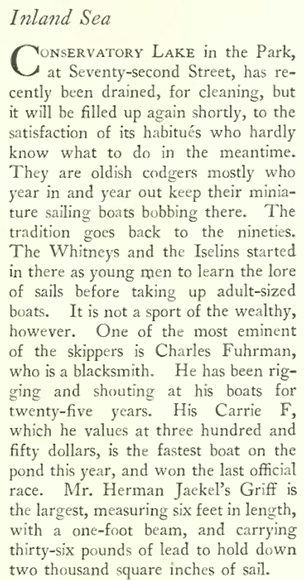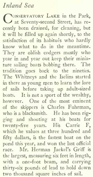 “The Talk of the Town” (via Theodore Pratt) looked in on the hobbyists who raced model boats at Central Park’s Conservatory Lake, a happy tradition that began in the late 19th century and continues to this day: