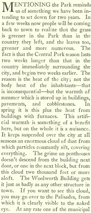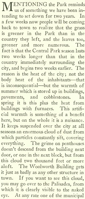 Leaving the cool and quiet of the park brought one quickly back into the dust and clamor of the metropolis. Pratt observed that the summer season lasted two weeks longer in the city than in the country, thanks to the city’s heat island effect— perhaps an unwelcome observation given the usually hot summer of 1929. Not only did the city’s heat extend the season, but it also kept the city enveloped in “an enormous cloud of dust”…