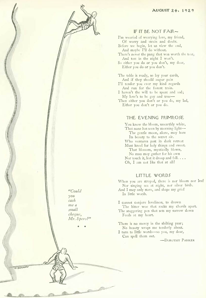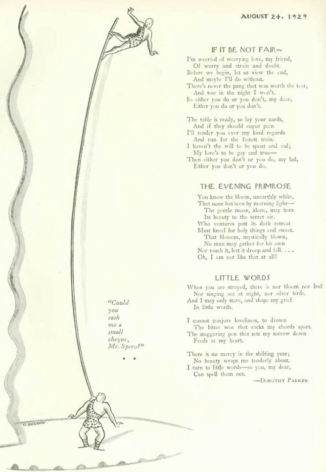 …thanks to the skills of The New Yorker’s first layout artist, Popsy Whitaker, we have this whimsical pairing of Otto Soglow and Dorothy Parker…