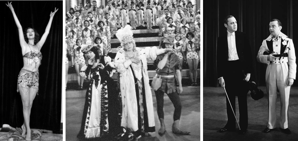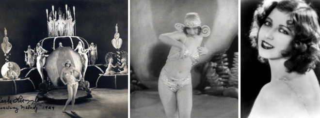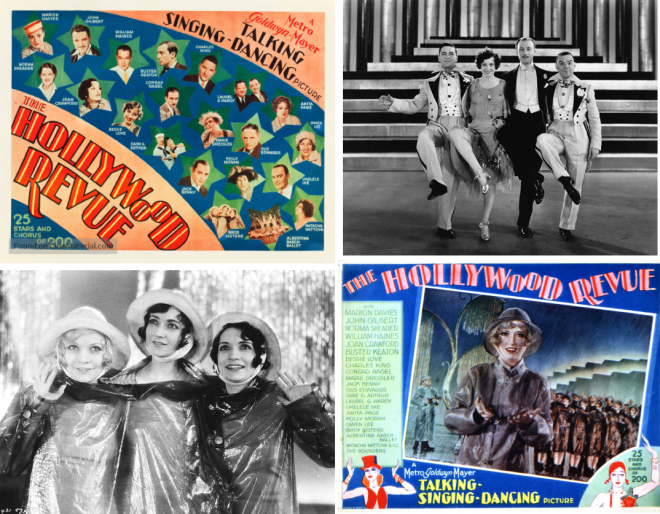 FAREWELL ROMEO…A lobby card promoting The Hollywood Revue of 1929 featured John Gilbert and Norma Shearer in one the film’s color sequences, a parody of Romeo and Juliet filled with Jazz Age slang. At right, a scene from the skit in which the director (played by Lionel Barrymore, far right) tells Shearer and Gilbert to put more pizzazz into the act. (IMDB/YouTube)STAR-STUDDED…Left to right, early silent film comedian Marie Dressler hammed it up in a royal court skit; co-emcee Jack Benny, with his trademark violin, and Cliff “Ukulele Ike” Edwards, and his trademark uke. (vickielester.com/doctormacro.com/thejumpingfrog.com)DANCING IS GOOD FOR YOUR HEALTH…Chorus girl Carla Laemmle in the film’s “Tableau of Jewels,” in which she emerged from a seashell to perform a seductive (and weird) dance number while other showgirls posed on a revolving crown — all set to a tune sung offstage by James Burroughs. The niece of Universal Pictures founder Carl Laemmle, Carla Laemmle was one of the longest surviving actors of the silent era. She died in 2014 at age 104. (songbook1.wordpress.com)GALAXY OF STARS…Clockwise, from top left, lobby card for The Hollywood Revue of 1929; Charles King, Joan Crawford, Conrad Nagel (a co-emcee along with Jack Benny) and Cliff “Ukulele Ike” Edwards show off their dancing skills; lobby card featuring actress Marion Davies; a popular act in vaudeville and on Broadway, the Brox Sisters—Lorayne, Patricia and Bobbe (along with Cliff Edwards) introduced the song “Singin’ in the Rain,” also sung by the entire cast near the finale of the movie. (IMDB/joancrawfordbest.com/mubi.com)