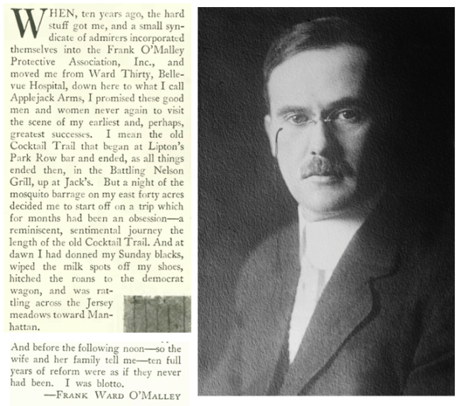 Occasionally I like to feature infrequent or one-time New Yorker contributors who are nearly lost to history. Frank Ward O’Malley (1875-1932), a reporter for the New York Sun from 1906-19, was known for his humorous stories. In 1928 he published a book titled The Swiss Family O’Malley. In this casual (titled “The Fatty Degeneration of Broadway”) from the Aug. 24 issue, O’Malley described an alcohol intervention of sorts and then his fall off the wagon. Here are the opening and closing paragraphs, along with his photo circa 1910s.