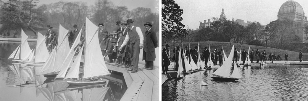 A DAY AT THE RACES….Model sailboats (left) prepare to face off in 1910 at Conservatory Lake (also called Conservatory Water); at right, model sailors at the same lake around 1920. (Library of Congress)