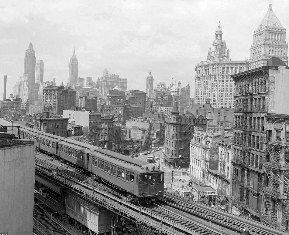 HAZY DAYS OF SUMMER…A dusty haze hangs over Lower Manhattan as the Third Avenue elevated train rumbles by in this circa 1950 photo. (Associated Press)