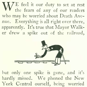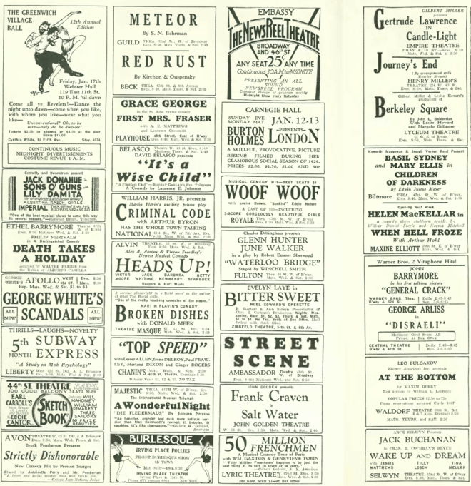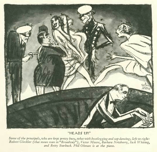Enter lyricist Morrie Ryskind, who reworked the script, softening its political message and remaking the war plot into a dream sequence. The revised play proved to a be hit, running for 191 performances at the Times Square Theatre. It also introduced a number of popular songs, including “The Man I Love” and “Strike Up the Band.” Robert Benchley was on hand for opening night: