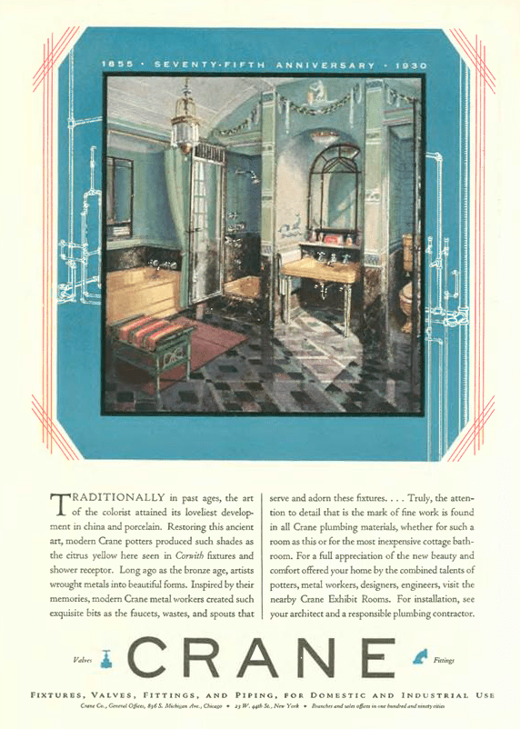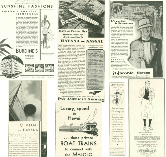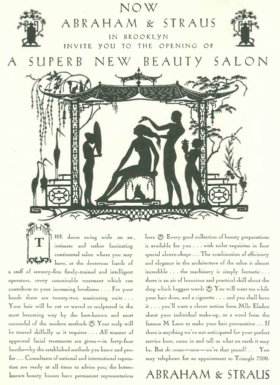 …on to our other advertisements, we have this entry from Elizabeth Arden…ads from this salon chain in the 1920s and 30s featured this ubiquitous image of a woman with a distant stare, her head tightly bound — mummy-like — as part of a firming treatment called “muscle-strapping”…