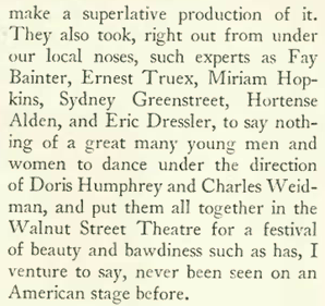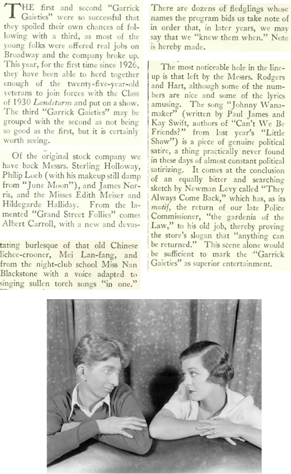 New Yorkers could escape the summer heat by taking in the latest incarnation of the Garrick Gaities at Broadway’s Guild Theatre. Character and voice actor Sterling Holloway Jr., (1905-1992) best known today as the voice of Disney’s Winnie the Pooh, appeared in all three Garrick Gaiety revues (1925, 1926, 1930), which were staged as benefits for New York’s Theatre Guild. Robert Benchley offered this review: