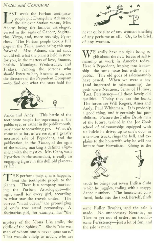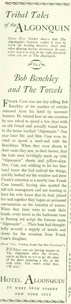 The Hotel Algonquin ran a series of ads in the back pages of The New Yorker that capitalized on its reputation as a place where stars and other notables gather. And although the Algonquin Round Table was a thing of the past, the hotel made sure to showcase names forever associated with the famed table, including Robert Benchley and the hotel’s manager, Frank Case…