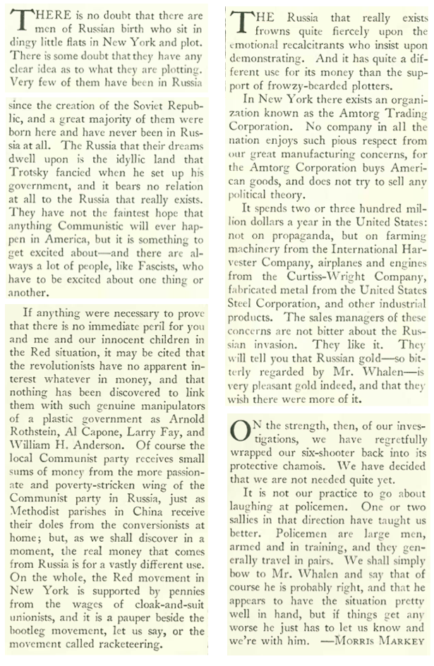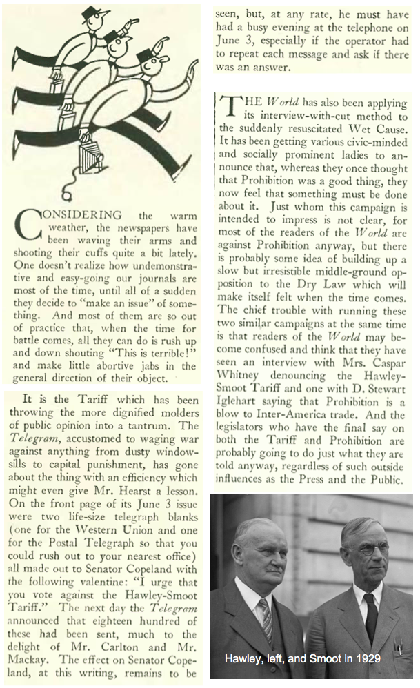 Some things never change. The Hawley–Smoot Tariff Act, sponsored by Representative Willis C. Hawley and Senator Reed Smoot and approved June 17, 1930, raised tariffs on more than 20,000 imported goods. Promoted as a way to protect American businesses and farmers, it put additional strain on international markets already reeling from the effects of the Depression. A resulting trade war severely reduced imports and exports. Writing for “The Wayward Press,” Robert Benchley (under the pen name Guy Fawkes) shared these observations: