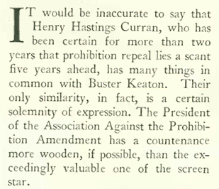 Despite his sober demeanor, Henry Hastings Curran (1877-1966) was a champion for those seeking the repeal of Prohibition laws. A longtime city manager in several roles, in 1930 he was president of the Association Against Prohibition Amendment. According to profile writer Henry Pringle, Curran predicted the end of Prohibition in five years. Happily for the wet side, they would get their wish in just three. A brief excerpt from the profile, titled “The Wet Hope.”