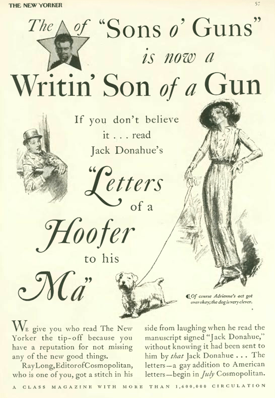…hoping for some crossover interest from New Yorker readers, William Randolph Hearst’s Cosmopolitan (then a publisher of fiction, not sex tips) promoted this fictionalized autobiography of a famous tap dancer in this full page ad…