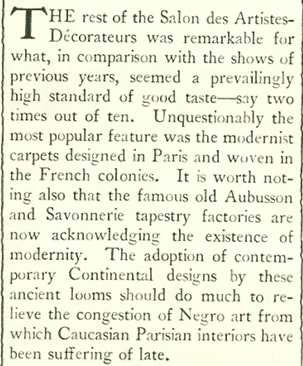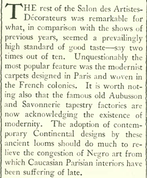 Many critics and commentators at the time characterized the Salon as a nationalistic showdown between French luxury decor and German efficiency and standardization. Flanner suggested that while the Germans seemed to be throwing out the rule book, the French were accepting modernity at a much slower pace: