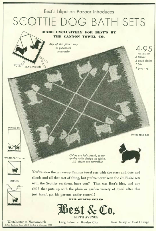 The Scottish Terrier was one of the most popular dog breeds in 1930s America (in addition to martinis, FDR was also fond of Scotties, including his loyal companion Fala), and you could show your love for the breed with bath sets from Best & Company…