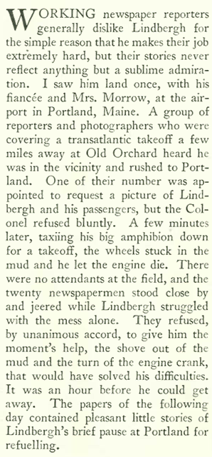 Because he was a national hero of nearly saint-like dimensions, newspaper reporters did not dare to report on his antics at the Cleveland Air Races (so far, The New Yorker account is the only one I can find of the incident). Needless to say, he was not popular among members of the fourth estate: