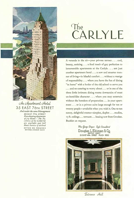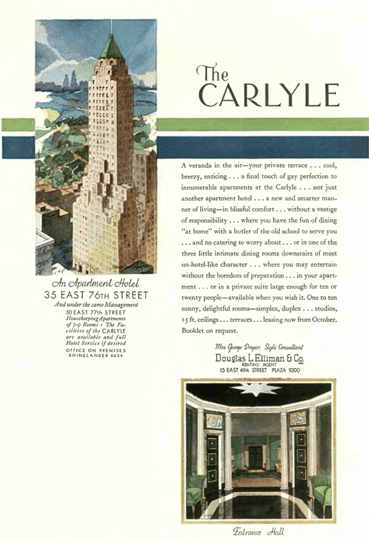 …another exclusive New York destination, the Carlyle, opened as a luxury residential hotel in 1930, only to go into receivership in 1931 thanks to the deepening Depression. In the postwar years it would rise to prominence and become a favorite haunt of the Kennedy family. The Carlyle is also home to the Bemelmans Bar, which is decorated with murals painted by Ludwig Bemelmans depicting his storybook character, Madeline, in Central Park…