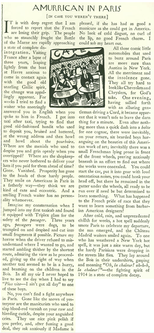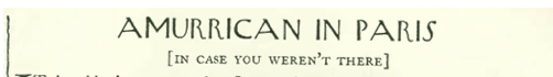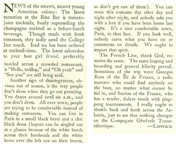 It was a nice surprise to find Lois Long once again writing under her pen name “Lipstick” in this casual piece (excerpted below) on Parisian life. I was also surprised to find the term “Amurrican” in the headline — I always thought it was a more recent derivation of redneck-speak…