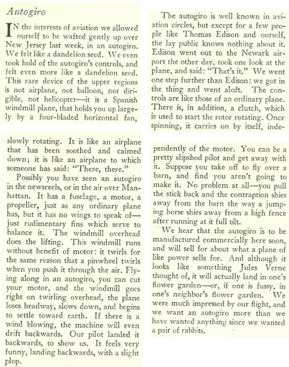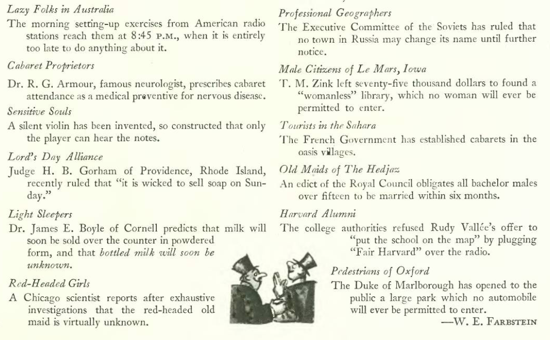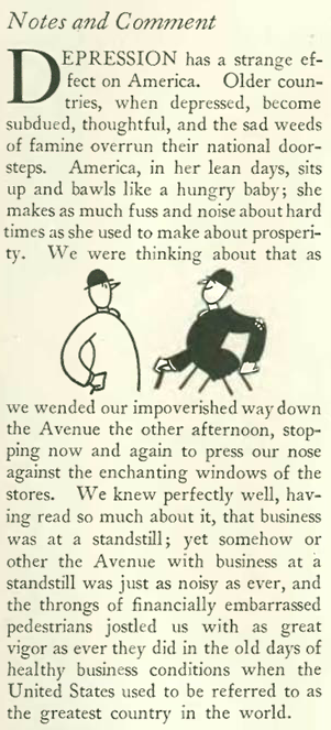 …and now we step back to the Nov. 15 issue, where E.B. White offered a less somber take on the Great Depression…
