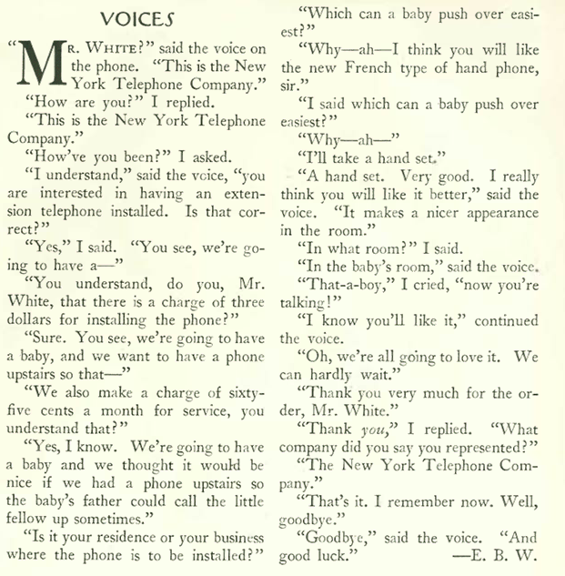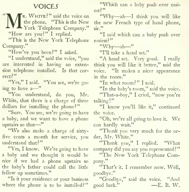 Long, long before cell phones, telephones were heavy stationary devices that required a certain amount of planning before installation, as E.B. White explains: