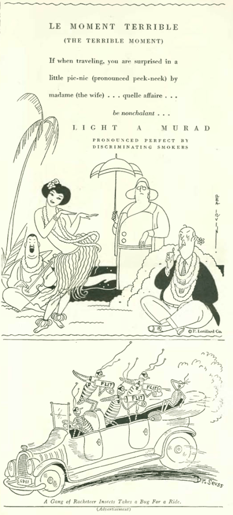 …one of the contributors to the album was Rea Irvin, founding illustrator for The New Yorker, here doing some business with Murad cigarettes…also another Flit insecticide ad by Dr. Seuss…
