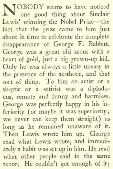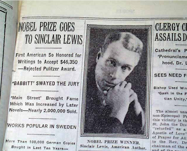 Sinclair Lewis famously declined the Pulitzer Prize for his 1925 novel Arrowsmith, upset that his 1920 novel Main Street had not previously won the prize. But when the Swedish Academy came calling with a Nobel Prize in Literature in 1930, he happily accepted. According to “The Talk of the Town,” this award also seemed a bit tardy, since Lewis’s small town booster archetype, George F. Babbitt, did not fit the dour days of the Great Depression. But it turned out that the 1922 novel Babbitt was ultimately what swayed the Nobel jury: