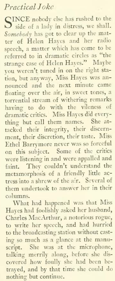 Those of a certain age might remember Helen Hayes as a sweet old lady who appeared on a number of TV shows in the 1970s and 80s, or as the mother in real life of James MacArthur, Disney teen star and later the portrayer of Danny “Book ’em Danno” Williams on the original Hawaii 5-0 TV series. Hayes was married to playwright Charles MacArthur, and “The Talk of the Town” takes it from there…